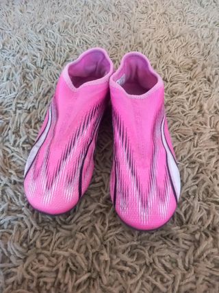 Botas de fútbol Puma Ultra en color rosa, talla 33. - Diseño llamativo en rosa y blanco. - Cordones para un ajuste seguro. - Suela con tacos, perfecta para césped artificial. - Talla europea 33, # 20cm. - Poquísimo uso.