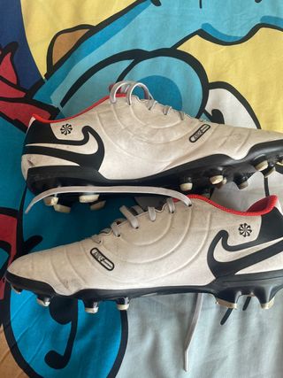Botas de tacos para fútbol 11, marca Nike. - Modelo Tiempos. - Color blanco con detalles en negro y rojo. - Talla 41 (26cm)