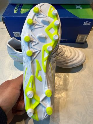Botas de fútbol Joma en color blanco con detalles en verde lima y plateado. Perfectas para césped natural. - Marca: Joma - Color: Blanco, verde lima, plateado - Cierre: Cordones - Suela: Tacos para césped natural