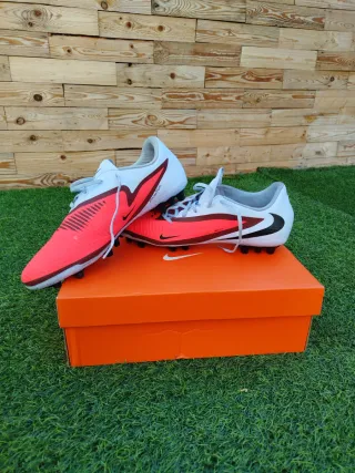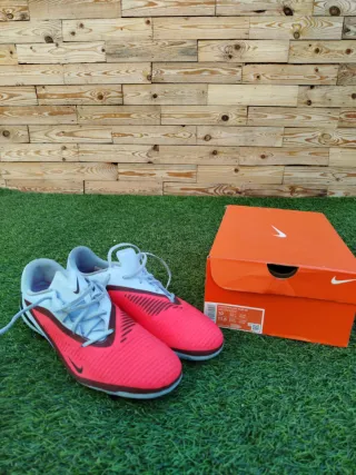 Botas de fútbol Nike Phantom. - Diseño deportivo. - Logo de Nike en la plantilla. - Ilustraciones de la suela en etiqueta.