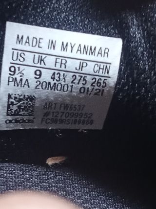 Botas de fútbol Adidas fabricadas en Myanmar. - Talla US 9.5, UK 9, FR 43 1/3, JP 275, CHN 265. - Modelo PMA 20M001. - Fabricadas en 01/21. - Referencia ART FW6537. - Código #127099952. - Código FC909RS109880.