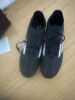 Botas de fútbol a estrenar, talla 43. Diseño moderno en negro con detalles en rojo. - Cierre con cordones. - Suela con tacos para césped. - Marca visible en la lengüeta.