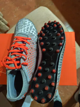 Zapatillas de fútbol con tacos muy poco usadas, marca PUMA numero 43 con un diseño moderno y llamativo. - Parte superior en plateado con detalles en naranja. - Suela de goma con tacos para un buen agarre.