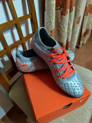 Botas de fútbol Nike en color rosa y gris. Ideales para jugar en césped artificial. Están nuevas solo se han usado una vez - Diseño moderno y llamativo. - Cierre con cordones. - Suela con tacos para un buen agarre.