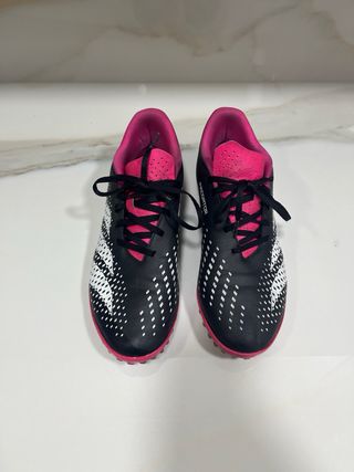 Botas de fútbol Adidas Predator en color negro y detalles en rosa. - Talla 43. - Diseño multitaco. - Cierre con cordones.
