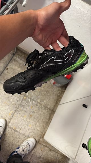 Botas de fútbol Joma con microtacos, en perfecto estado tras un solo uso, las compré solo para un partido porque viajé y no llevé mis botas . - Color negro con detalles verdes y plateados. - Talla 43. - Diseño deportivo. - Cierre con cordones.