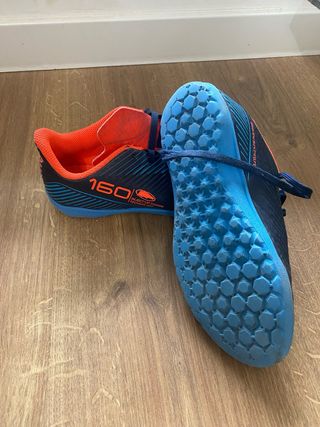 Botas de fútbol Kipsta de Decathlon, modelo 160. - Diseño en azul y naranja. - Suela con tacos hexagonales para mayor agarre. - Cierre con cordones.
