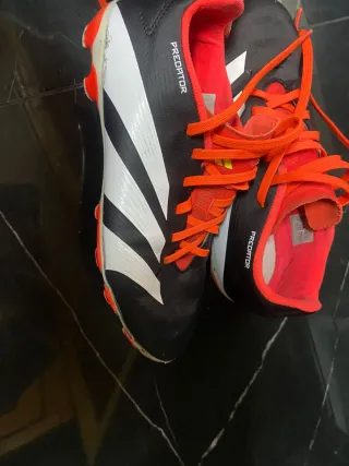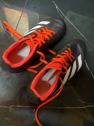 Botas de fútbol Adidas Predator en color negro con detalles en blanco y naranja. Poco uso (4 meses) las vengo porque le van pequeñas. - Cierre con cordones. - Diseño deportivo. - Marca Adidas Predator.