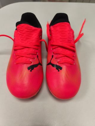 Botas de fútbol Puma en color rosa vibrante con detalles amarillos. Perfectas para jugar en césped. Nuevas probadas un día y se le han quedado pequeñas después del verano - Talla 31. - Marca Puma. - Cierre con cordones.