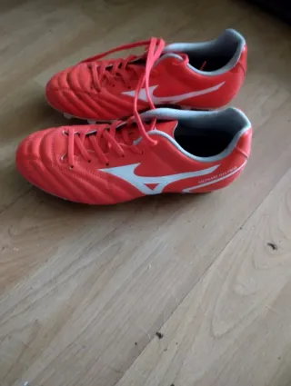 Botas de fútbol para niño de la marca Mizuno en color naranja. - Diseño deportivo. - Cierre con cordones. - Logo de la marca en blanco.