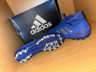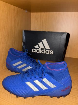 Botas de fútbol Adidas Predator en color azul. Diseñadas para un buen agarre en el campo. - Color azul con detalles plateados. - Logo de Adidas en los laterales. - Nombre 'Predator' en el talón. - Usadas solo 1 vez