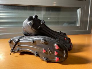 Botas de fútbol Adidas en color negro con detalles en rojo y blanco. - Diseño deportivo. - Cordones negros. - Suela con tacos. Puntera un poco despegada