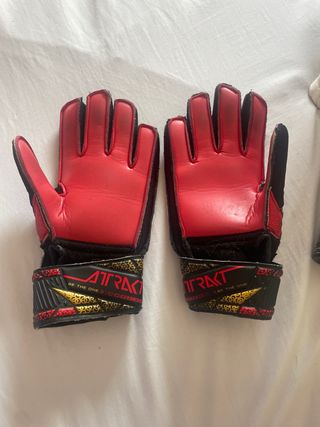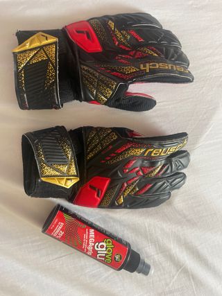 Par de guantes de portero Reusch talla 7 en color negro, rojo y dorado. Incluye un bote de pegamento para guantes. - Diseño con detalles dorados. - Cierre de velcro. - Marca Reusch. -Palma làtex