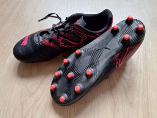 Botas de fútbol Puma en color negro con detalles en rojo. Diseñadas para césped. Están nuevas, se aprecia en las fotos. Se usaron en un par de entrenamientos al final del verano y se han quedado pequeñas.