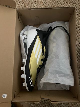 Botas de fútbol Adidas Messi F50. Talla 39,5 - Diseño en color dorado y negro. - Detalles de las 3 rayas de Adidas en blanco. - Cierre con cordones.