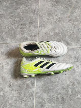 Botas de fútbol para niño con un diseño llamativo en blanco y verde neón. - Talla: 34 EU - Marca: Adidas - Cierre de cordones - Tacos para césped artificial o natural
