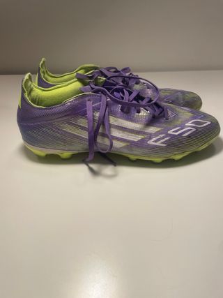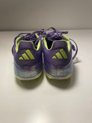 Botas de fútbol Adidas F50 en morado y verde, en muy buen estado. Se han utilizado durante dos meses y estan como nuevas. - Diseño deportivo. - Cordones morados. - Suela con tacos.