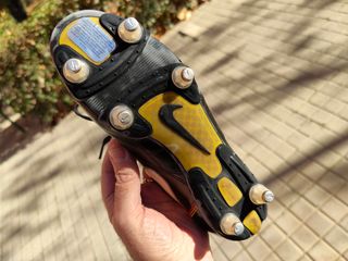 Míticas botas de fútbol Ronaldinho 10 originales de tacos recambiables de la primera época de la talla 37.5 fabricadas en Bosnia y realizadas en piel que es el modelo más buscado por los coleccionistas y difícil de conseguir en buen estado con los tacos recambiables originales Nike. En buen estado y tan solo puestas en un breve entrenamiento. Mejor ver todas las fotos.