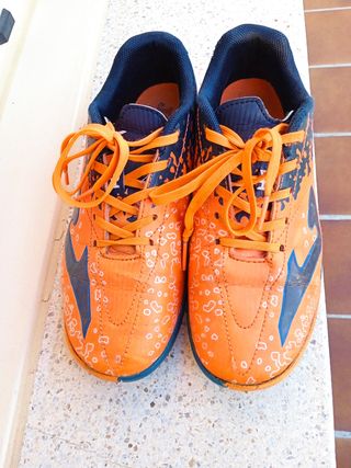 Botas de fútbol para niño en talla 31. Color naranja con detalles en negro. - Cierre con cordones. - Diseño deportivo.