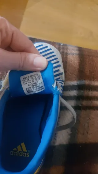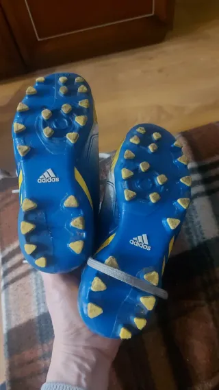 Botas de fútbol Adidas Predator para niño en talla 29. Diseñadas para ofrecer un buen agarre en el campo. - Color azul con detalles amarillos. - Suela con tacos para césped. - Marca Adidas Predator.