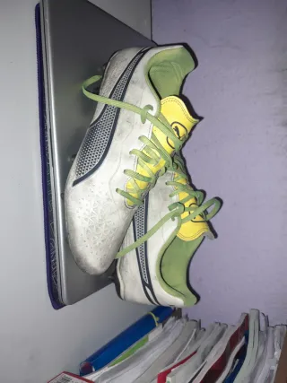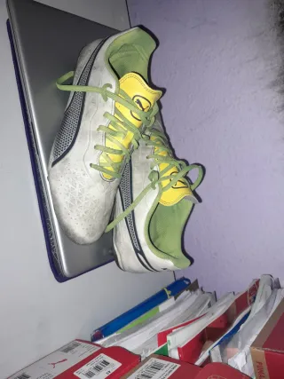 Botas de fútbol Puma en color blanco con detalles en amarillo. Talla 42.5. - Diseño deportivo. - Cordones de ajuste. - Marca Puma. Precio no negociable y las vendo porque ya no me valen.