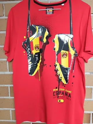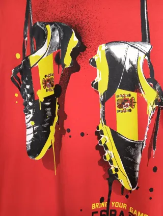 Comprada en C&A, para 170/176 cms de estatura Estado IMPECABLE Camiseta de color rojo con diseño de botas de fútbol y la bandera de España. Estampado Brine Your Game España Supporters Area.