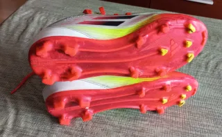 Botas de fútbol Adidas F50 en color blanco, azul y rojo. Diseñadas para un rendimiento óptimo en el campo. - Modelo F50. - Combinación de colores blanco, azul y rojo. - Cierre con cordones.estan en perfecto estado