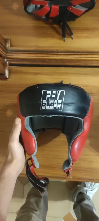 Casco de boxeo de la marca Ray Sugar, lo vendo porque ya no lo uso. Talla M. Esta en condiciones aceptable para seguir usandose - Material exterior de cuero sintético. - Cierre ajustable. - Diseño con protección para las orejas.