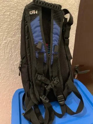 Mochila de senderismo con depósito de agua integrado. Diseñada para actividades al aire libre. - Color azul, gris y negro. - Compartimentos de malla laterales. - Cintas ajustables. - Cierre de hebilla.