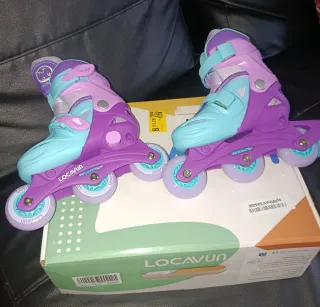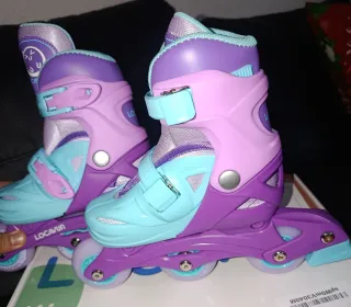 Patines ajustables para niña, ideales para iniciarse en el patinaje. - Talla ajustable de 26 a 29. - Diseño en colores morado y turquesa. - Cierre de velcro y hebilla para un ajuste seguro. - Ruedas de patinaje en línea. - Precio original 45€.