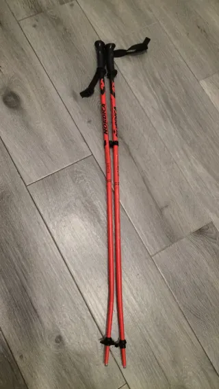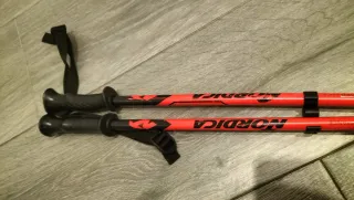 Bastones Esquí Nórdica 110 cm. Uno de los bastones está un poco torcido en la punta; el otro bastón tiene parcialmente roto el disco de plástico. - Color rojo con detalles en negro. - Empuñaduras ergonómicas para un agarre cómodo. - Correas ajustables para mayor seguridad.