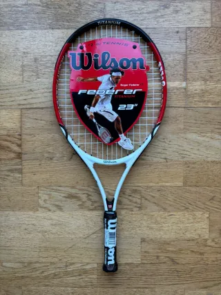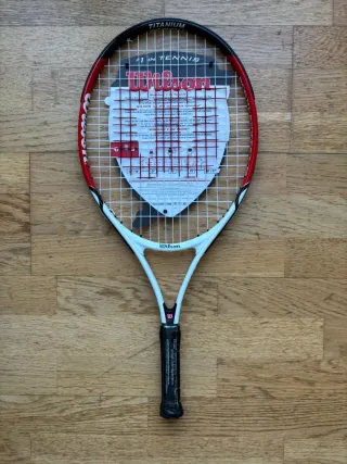 Raqueta de tenis Wilson Titanium. - Marco con detalles en rojo y negro. - Cuerdas blancas. - Logo de Wilson en el marco y el grip.