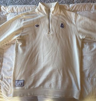 Sudadera Real Madrid Terrace Icon en color blanco roto, talla L. Presenta un diseño con cremallera de un cuarto y el escudo del club. Sudadera Limitada de la firma Terrace Icon, comprada en Futbol Emotion, 100% original. No se ha llegado a usar.