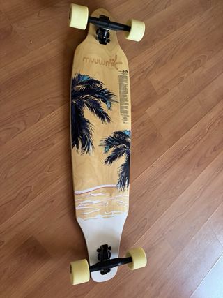Longboard skate de la marca MUUWMI, ideal para desplazamientos y trucos. - Tabla de madera. - Ruedas amarillas. - Diseño deportivo. Sin estrenar como se puede ver en las ruedas