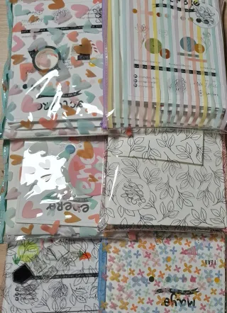 Álbum de 9x12 de Kimidori lomo ancho. 12 euros cada uno excepto el de topos que serían 8 (tiene una pequeña marca en el lomo). Del de la segunda foto hay dos unidades. Fundas 5 euros el paquete. Maxipack 30 fundas 12 euros.