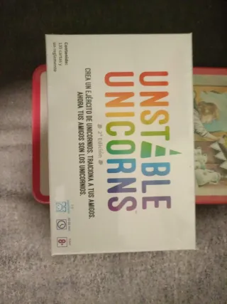 Juego de cartas Unstable Unicorns, 2ª Edición, completamente precintado. - Contiene 135 cartas y un reglamento. - Ideal para 2-8 jugadores. - Duración aproximada de 30-60 minutos. - Edad recomendada: 8+.