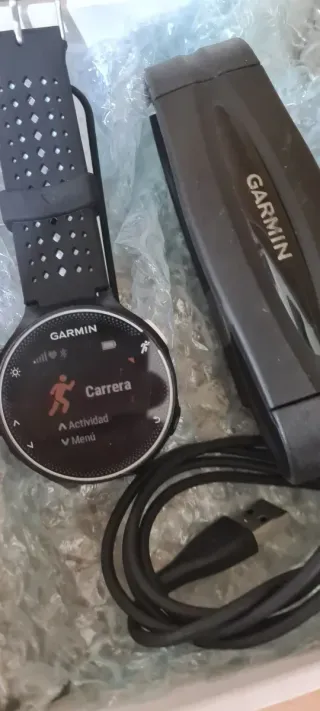 Reloj GPS con monitor de frecuencia cardiaca en la muñeca, monitor de actividad y notificaciones inteligentes,El GPS integrado controla la distancia, lo rápido y lo lejos has llegado Funciones de online2: notificaciones inteligentes, cargas automáticas a Garmin Connect, seguimiento en tiempo real y control de la música.Incluye herramientas de entrenamiento como los intervalos, indicaciones de audio y un perfil de actividad específica de carrera/caminar Perfiles deportivos precargados para carrera, carrera en interior, ciclismo y cardio.Muy buen estado, ver fotos, con cargador