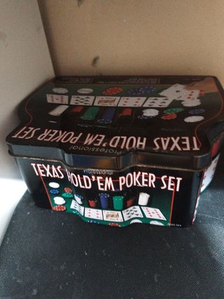 Juego de póquer Texas Hold'em en caja metálica. Ideal para jugar con amig@s. - Incluye fichas y cartas. - Caja en buen estado. - Perfecto para llevar a cualquier parte.