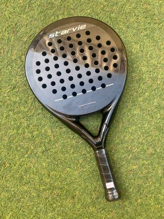 Pala de pádel de la marca STARVIE nueva, sin usar, con forma redonda, color negro y un diseño moderno y elegante. Tamaño de mango 12cm con tapon circular. Orientada a jugadores polivalentes que buscan control y potencia. punto dulce amplio, superior al estándar. Mismo molde que la primera pala Puma del jugador profesional Momo González.