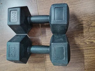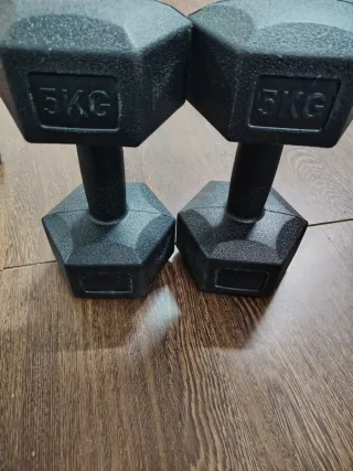 Par de mancuernas de 5 kg cada una, perfectas para entrenar en casa. - Diseño hexagonal para mayor estabilidad. - Empuñadura texturizada para un agarre seguro. - Peso: 5 kg por mancuerna.