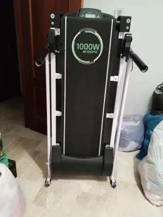 Cinta de andar y correr Cecotec con motor de 1000W. - Diseño plegable para fácil almacenamiento. - Incorpora pantalla con botones - Asas ergonómicas para mayor comodidad. - Ruedas para su desplazamiento.