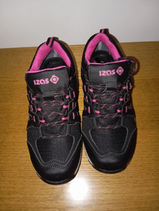 Zapatillas de trekking de la marca Izas en color negro con detalles en rosa. - Cierre con cordones. - Diseño deportivo. - Suela de goma.