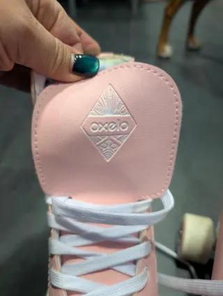 Patines en línea de color verde menta y rosa de la marca Oxelo, están en perfectas condiciones. - Talla ajustable 34-36. - Cierre de hebilla. - Ruedas de color rosa.