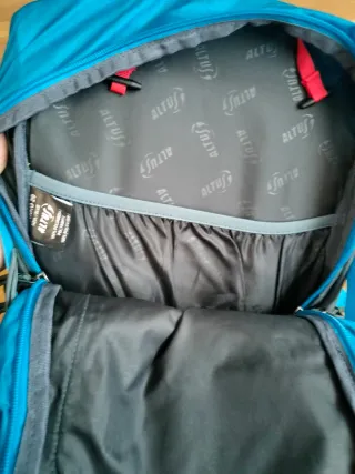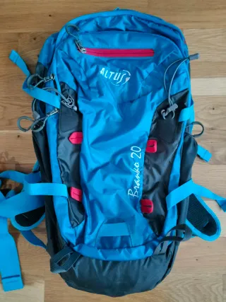 Mochila de senderismo Altus Branko de 20 litros. Está nueva excepto un roto en la parte de abajo apenas inapreciable - Color azul y gris. - Cremallera frontal en color rosa. - Múltiples enganches y cintas. - Logo de Altus en la parte frontal.