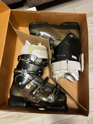 Bota de esquí Head para mujer, talla 25. - Diseño en color negro y transparente con detalles dorados. - Cierres de hebilla ajustables. - Interior forrado para mayor comodidad. - Flex 90-80 -250/235 Usadas 3/4 veces. Flex 90-80