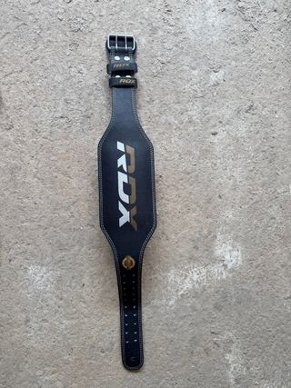 Cinturón de gimnasio RDX de cuero negro, diseñado para soporte lumbar. - Cierre de hebilla metálica. - Diseño ergonómico y acolchado. - Logo RDX en dorado y blanco. - Talla M.