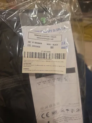 Inmovilizador de hombro marca Sportherapy en color negro y talla M. Diseñado para brindar soporte. - Modelo: IMMOBILIZZATORE SPALLA - Talla: M - Color: NERO-BLACK - Código: ST-BSNMOB