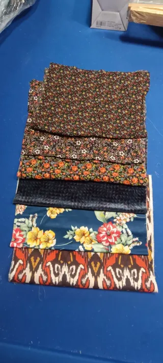 Lote de retales de telas con diferentes estampados y texturas - Tela con estampado floral pequeño sobre fondo oscuro. - Tela con estampado de flores naranjas y hojas. - Tela lisa de color azul marino con textura. - Tela con estampado floral grande en tonos azules, amarillos y rojos. - Tela con estampado geométrico estilo ikat en tonos marrones, naranjas y blancos.