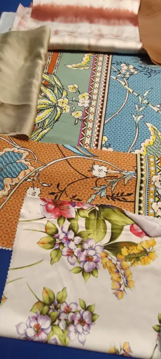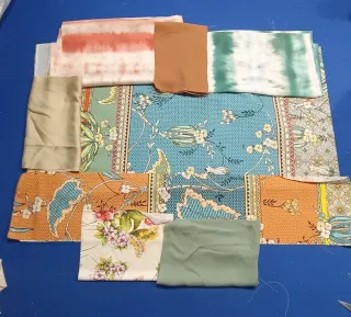 Conjunto de retales de tela con diferentes estampados y colores. - Telas con motivos florales. - Diseños abstractos y tie-dye. - Tonos tierra, verdes y azules.