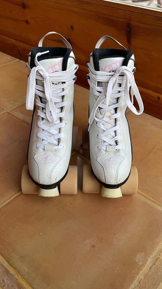 Patines KRF estilo retrofashion en talla 38. - Diseño blanco con detalles en rosa. - Cordones blancos. - Ruedas de color beige. Se han usado durante 6 meses. Están muy bien cuidados, únicamente la pastilla de goma de freno está parcialmente gastada, pero se puede cambiar y es barata . Se incluye bolsa de transporte.